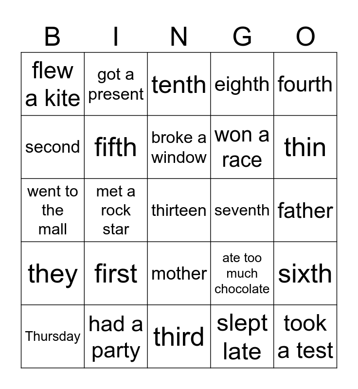 This bingo card has a free space and 24 words: first, had a party, broke a window, Thursday, fourth, flew a kite, second, got a present, seventh, mother, won a race, went to the mall, ate too much chocolate, sixth, fifth, slept late, father, tenth, thin, met a rock star, took a test, they, eighth and third.