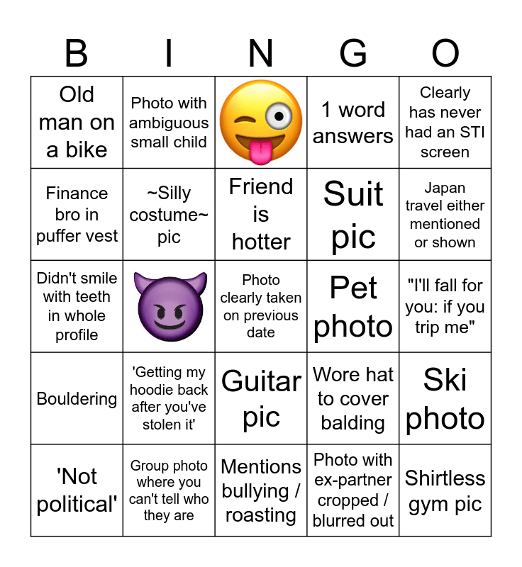 This bingo card has 2 images, a free space and 22 words: 'Getting my hoodie back after you've stolen it', Group photo where you can't tell who they are, Friend is hotter, 'Not political', Clearly has never had an STI screen, Old man on a bike, Finance bro in puffer vest, Photo with ambiguous small child, Pet photo, Guitar pic, Suit pic, Didn't smile with teeth in whole profile, Wore hat to cover balding, Ski photo, ~Silly costume~ pic, Photo with ex-partner cropped / blurred out, "I'll fall for you: if you trip me", Japan travel either mentioned or shown, Shirtless gym pic, Bouldering, 1 word answers and Mentions bullying / roasting.