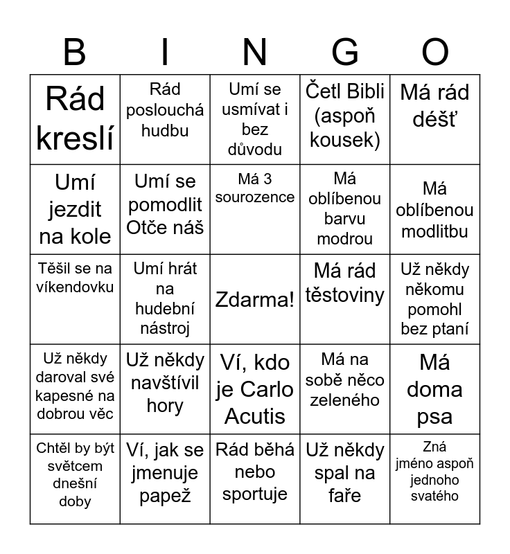 This bingo card has a free space and 24 words: Už někdy navštívil hory, Ví, jak se jmenuje papež, Má 3 sourozence, Chtěl by být světcem dnešní doby, Má rád déšť, Rád kreslí, Umí jezdit na kole, Rád poslouchá hudbu, Má rád těstoviny, Ví, kdo je Carlo Acutis, Má oblíbenou barvu modrou, Těšil se na víkendovku, Má na sobě něco zeleného, Má doma psa, Umí se pomodlit Otče náš, Už někdy spal na faře, Už někdy někomu pomohl bez ptaní, Umí se usmívat i bez důvodu, Má oblíbenou modlitbu, Umí hrát na hudební nástroj, Zná jméno aspoň jednoho svatého, Už někdy daroval své kapesné na dobrou věc, Četl Bibli (aspoň kousek) and Rád běhá nebo sportuje.