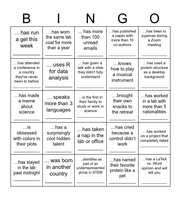 This bingo card has 30 words: ... was born in another country _________, ..is left-handed ______, ... speaks more than 3 languages _________, ... is more than 190 cm tall _________, ... has run a gel this week _________, ... has more than 100 unread emails __________, ... uses R for data analysis _________, ... has taken a nap in the lab or office _________, …brought their own snacks to the retreat __________, …identifies as part of an underrepresented group in STEM ______________, …has worked in a lab with more than 5 nationalities ___________, …is the first in their family to study or work in science _____________, …has named their favorite protein like a pet ___________, …has a LaTeX vs. Word opinion and will tell you ____________, …has used a protein structure as a desktop background _____________, …has considered becoming a barista at least once _____________, …has cried because a control didn’t work __________, …is obsessed with colors in their plots __________, …has a surprisingly cool hidden talent __________, …has been in pyjamas during a Zoom meeting ____________, …has made a meme about science __________, …has already had more than 3 cups of coffee today ___________, …has worn the same lab coat for more than a year ___________, …knows how to play a musical instrument __________, …has attended a conference in a country they've never been to before _____________, …has published a paper with more than 10 co-authors _____________, …has worked on a project that completely failed _____________, …has stayed in the lab past midnight ___________, …has given a talk with a slide they didn’t fully understand _____________ and …woke up late and skipped breakfast today ____________.