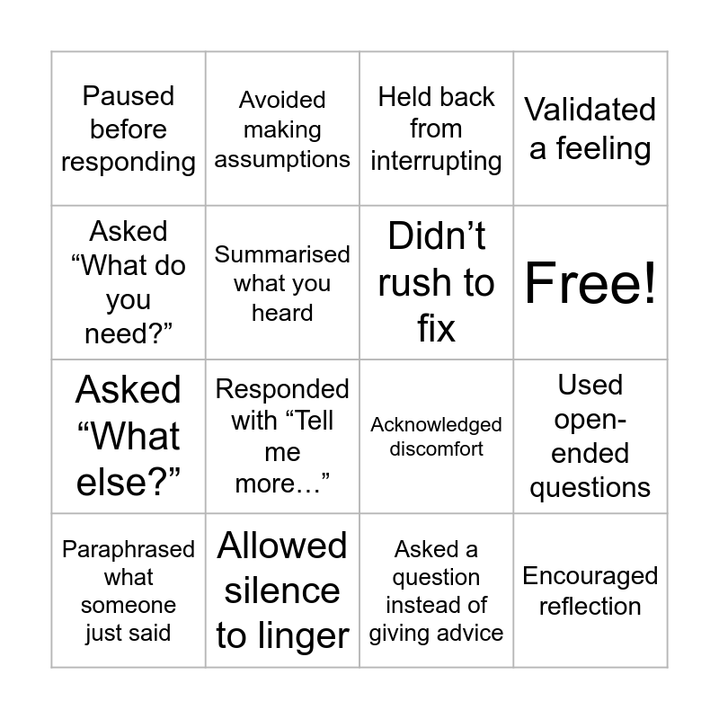 This bingo card has 17 words: Asked a question instead of giving advice, Paraphrased what someone just said, Held back from interrupting, Paused before responding, Responded with “Tell me more…”, Validated a feeling, Used open-ended questions, Didn’t rush to fix, Free!, Summarised what you heard, Allowed silence to linger, Acknowledged discomfort, Asked “What do you need?”, Avoided making assumptions, Asked “What else?”, Noticed your own reactions and Encouraged reflection.