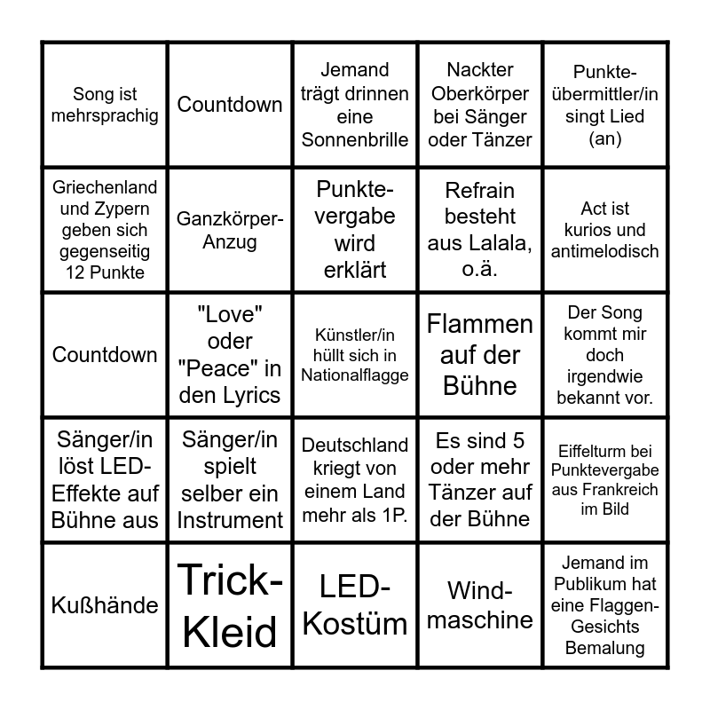 This bingo card has 50 words: Moderator/in hat sich umgezogen, Künstler/in hüllt sich in Nationalflagge, Traditionelles Kostüm / Tracht, LED-Kostüm, Sänger/in spielt selber ein Instrument, Gesang am Klavier, Countdown, Handherzen für die Zuschauer, Griechenland und Zypern geben sich gegenseitig 12 Punkte, Nebel auf der Bühne, Ganzkörper- Anzug, Nackter Oberkörper bei Sänger oder Tänzer, Eiffelturm bei Punktevergabe aus Frankreich im Bild, Es sind 5 oder mehr Tänzer auf der Bühne, "Europe, stop voting now", Telefongeste in die Kamera, Punkte-vergabe wird erklärt, Flammen auf der Bühne, Act selbst oder die Eltern standen beim ESC schon auf der Bühne, Punkte-übermittler/in singt Lied (an), "Love" oder "Peace" in den Lyrics, Wind-maschine, Song ist mehrsprachig, Refrain besteht aus Lalala, o.ä., Akrobatik auf der Bühne, Jemand im Publikum hat eine Flaggen- Gesichts Bemalung, Act ist kurios und antimelodisch, Dem Gastgeber wird für den Abend gedankt, Jemand trägt drinnen eine Sonnenbrille, Deutschland kriegt von einem Land mehr als 1P., Im Greenroom wird angestoßen, "Good Evening Europe good morning Australia", Sänger/in ist Barfuß, Jemand sagt „Grand Prix“, Trick-Kleid, 12 Punkte für Deutschland, Outfit aus Lack und Leder, Duett, Konfetti-Regen, Der Song kommt mir doch irgendwie bekannt vor., Goldregen, Overknees, "You're good to go", Die Halle singt laut hörbar mit, Kußhände, Countdown, Trommeln, Sänger/in steht auf Podest oder ähnlichem, Sänger/in löst LED-Effekte auf Bühne aus and wie aus einem Horrorfilm.