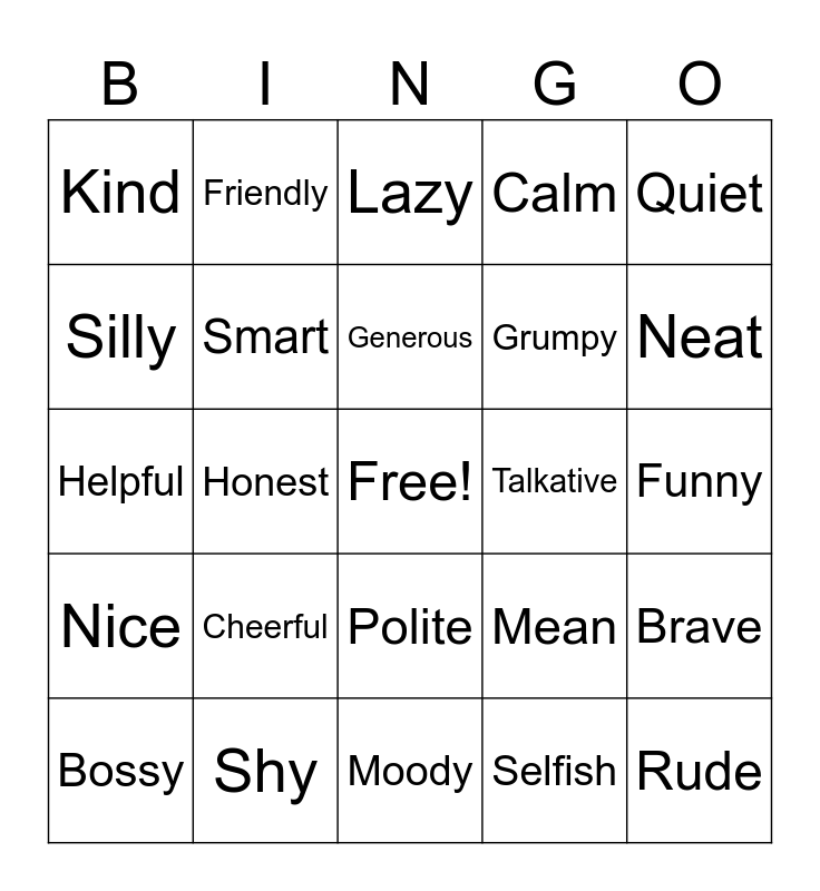 This bingo card has a free space and 24 words: Cheerful, Shy, Generous, Bossy, Quiet, Kind, Silly, Friendly, Talkative, Polite, Grumpy, Helpful, Mean, Brave, Smart, Selfish, Funny, Lazy, Neat, Honest, Rude, Nice, Calm and Moody.