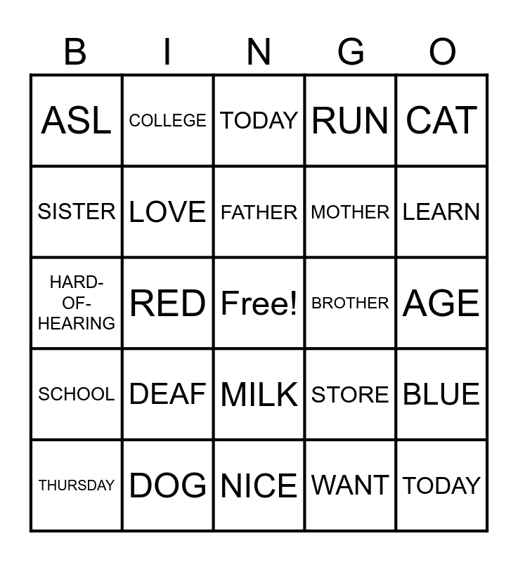 This bingo card has a free space and 24 words: DEAF, DOG, FATHER, THURSDAY, CAT, ASL, SISTER, COLLEGE, BROTHER, MILK, MOTHER, HARD-OF-HEARING, STORE, BLUE, LOVE, WANT, AGE, TODAY, LEARN, RED, TODAY, SCHOOL, RUN and NICE.