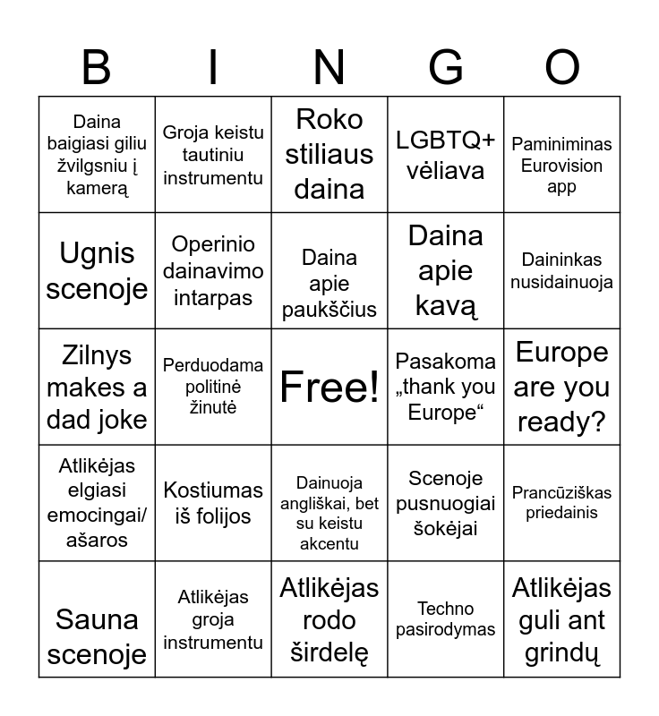 This bingo card has a free space and 24 words: Kostiumas iš folijos, Atlikėjas groja instrumentu, Daina apie paukščius, Sauna scenoje, Paminiminas Eurovision app, Daina baigiasi giliu žvilgsniu į kamerą, Ugnis scenoje, Groja keistu tautiniu instrumentu, Pasakoma „thank you Europe“, Dainuoja angliškai, bet su keistu akcentu, Daina apie kavą, Zilnys makes a dad joke, Scenoje pusnuogiai šokėjai, Prancūziškas priedainis, Operinio dainavimo intarpas, Techno pasirodymas, Europe are you ready?, Roko stiliaus daina, Daininkas nusidainuoja, Perduodama politinė žinutė, Atlikėjas guli ant grindų, Atlikėjas elgiasi emocingai/ ašaros, LGBTQ+ vėliava and Atlikėjas rodo širdelę.