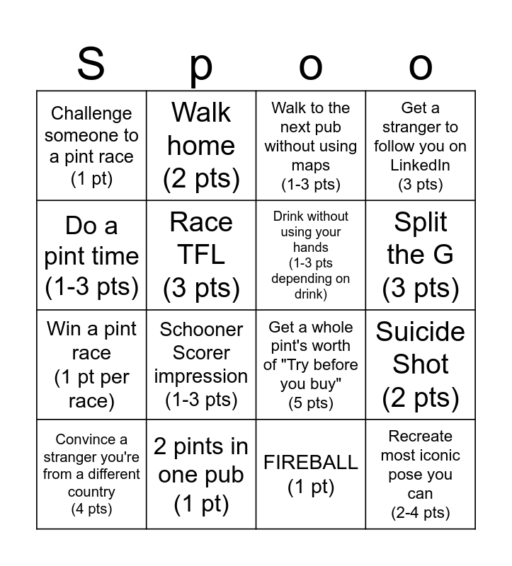 This bingo card has 16 words: 2 pints in one pub (1 pt), Suicide Shot (2 pts), Walk to the next pub without using maps (1-3 pts), Challenge someone to a pint race (1 pt), Win a pint race (1 pt per race), Walk home (2 pts), Get a whole pint's worth of "Try before you buy" (5 pts), FIREBALL (1 pt), Do a pint time (1-3 pts), Race TFL (3 pts), Convince a stranger you're from a different country (4 pts), Get a stranger to follow you on LinkedIn (3 pts), Schooner Scorer impression (1-3 pts), Split the G (3 pts), Drink without using your hands (1-3 pts depending on drink) and Recreate most iconic pose you can (2-4 pts).