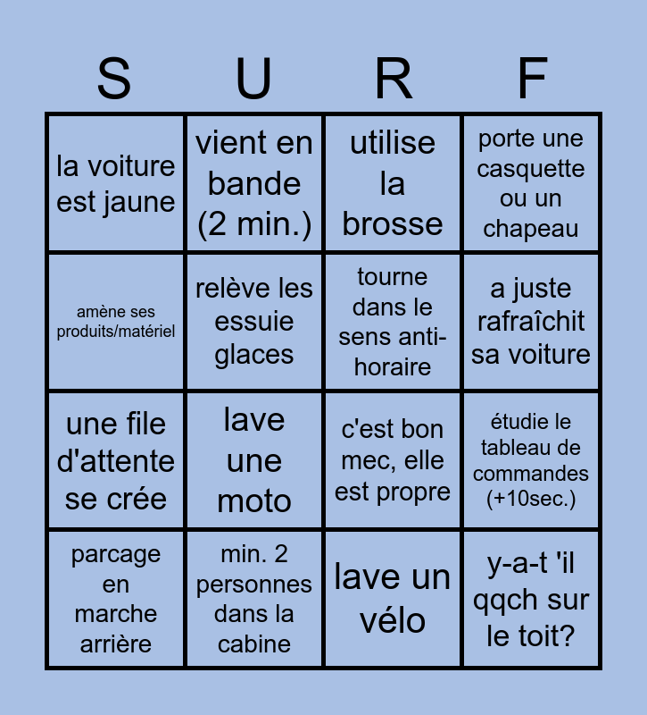 This bingo card has 19 words: parcage en marche arrière, utilise la mousse, utilise la brosse, étudie le tableau de commandes (+10sec.), tout le monde ne sort pas du véhicule, vient en bande (2 min.), lave un vélo, porte une casquette ou un chapeau, la voiture est jaune, lave une moto, tourne dans le sens anti-horaire, a juste rafraîchit sa voiture, une file d'attente se crée, min. 2 personnes dans la cabine, c'est bon mec, elle est propre, y-a-t 'il qqch sur le toit?, amène ses produits/matériel, relève les essuie glaces and une maintenance a lieu.