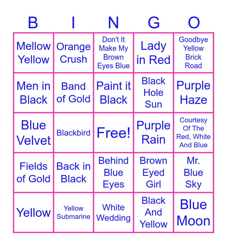 This bingo card has a free space and 24 words: Back in Black, Yellow Submarine, Paint it Black, Yellow, Goodbye Yellow Brick Road, Mellow Yellow, Men in Black, Orange Crush, Purple Rain, Behind Blue Eyes, Black Hole Sun, Blue Velvet, Brown Eyed Girl, Mr. Blue Sky, Band of Gold, Black And Yellow, Courtesy Of The Red, White And Blue, Don't It Make My Brown Eyes Blue, Purple Haze, Blackbird, Blue Moon, Fields of Gold, Lady in Red and White Wedding.
