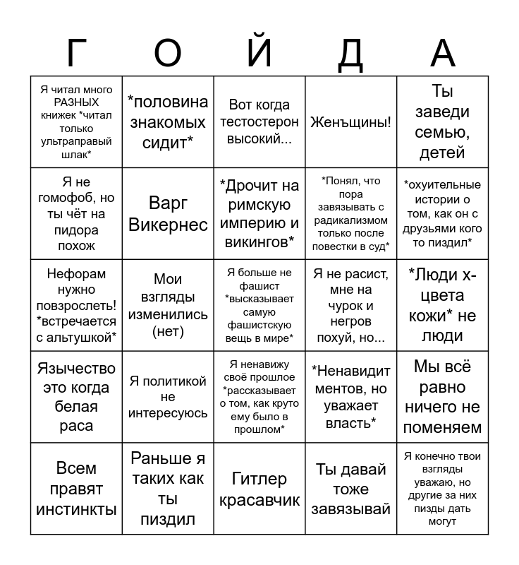 This bingo card has a free space and 24 words: Я политикой не интересуюсь, Раньше я таких как ты пиздил, *Дрочит на римскую империю и викингов*, Всем правят инстинкты, Ты заведи семью, детей, Я читал много РАЗНЫХ книжек *читал только ультраправый шлак*, Я не гомофоб, но ты чёт на пидора похож, *половина знакомых сидит*, Я не расист, мне на чурок и негров похуй, но..., Я ненавижу своё прошлое *рассказывает о том, как круто ему было в прошлом*, *Понял, что пора завязывать с радикализмом только после повестки в суд*, Нефорам нужно повзрослеть! *встречается с альтушкой*, *Ненавидит ментов, но уважает власть*, Мы всё равно ничего не поменяем, Варг Викернес, Ты давай тоже завязывай, *Люди x-цвета кожи* не люди, Вот когда тестостерон высокий..., *охуительные истории о том, как он с друзьями кого то пиздил*, Мои взгляды изменились (нет), Я конечно твои взгляды уважаю, но другие за них пизды дать могут, Язычество это когда белая раса, Женъщины! and Гитлер красавчик.