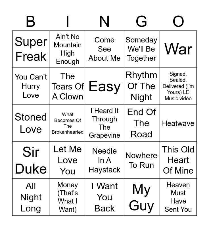 This bingo card has 52 words: Free!, I Heard It Through The Grapevine, Superstition, I Want You Back, Let Me Love You, My Girl, Ain't No Mountain High Enough, Dancing In The Street, You Can't Hurry Love, Let's Get It On, The Tears Of A Clown, Can't Help Myself, This Old Heart Of Mine, Nowhere To Run, Midnight Train to Georgia, Rock with You, Easy, End Of The Road, Do You Love Me, War, What Becomes Of The Brokenhearted, My Guy, Super Freak, Rhythm Of The Night, Somebody's Watching Me, Heaven Must Have Sent You, Needle In A Haystack, There's A Ghost In My House, Signed, Sealed, Delivered (I'm Yours) LE Music video, Jimmy Mack, Going To A Go-Go, Someday We'll Be Together, Every Little Bit Hurts, All Night Long, It's A Shame, Come See About Me, Money (That's What I Want), Nightshift, Ain't Too Proud To Beg, ABC, Papa Was A Rollin' Stone, Heatwave, Sir Duke, Reach Out I'll Be There - Edit, Needle In A Haystack, My World Is Empty Without You, Heaven Must Have Sent You, Stoned Love, Shop around, Don't Look Any Further, All Night Long and Take Me Girl, I'm Ready.