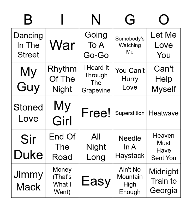 This bingo card has a free space and 51 words: Nowhere To Run, Midnight Train to Georgia, Rock with You, Easy, End Of The Road, Do You Love Me, War, What Becomes Of The Brokenhearted, My Guy, Super Freak, Rhythm Of The Night, Somebody's Watching Me, Heaven Must Have Sent You, Needle In A Haystack, There's A Ghost In My House, Signed, Sealed, Delivered, I Heard It Through The Grapevine, Superstition, I Want You Back, Let Me Love You, My Girl, Ain't No Mountain High Enough, Dancing In The Street, You Can't Hurry Love, Let's Get It On, The Tears Of A Clown, Can't Help Myself, This Old Heart Of Mine, Jimmy Mack, Going To A Go-Go, Someday We'll Be Together, Every Little Bit Hurts, All Night Long, It's A Shame, Come See About Me, Money (That's What I Want), Nightshift, Ain't Too Proud To Beg, ABC, Papa Was A Rollin' Stone, Heatwave, Sir Duke, Reach Out I'll Be There - Edit, Needle In A Haystack, My World Is Empty Without You, Heaven Must Have Sent You, Stoned Love, Shop around, Don't Look Any Further, All Night Long and Take Me Girl, I'm Ready.