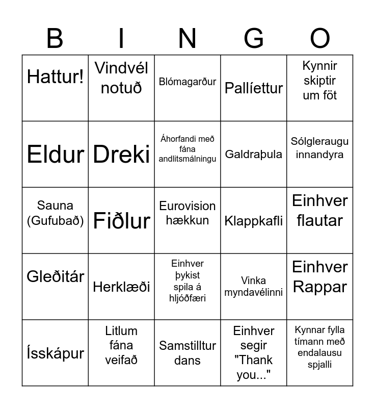 This bingo card has 25 words: Herklæði, Samstilltur dans, Áhorfandi með fána andlitsmálningu, Ísskápur, Kynnir skiptir um föt, Hattur!, Eldur, Vindvél notuð, Klappkafli, Einhver þykist spila á hljóðfæri, Galdraþula, Sauna (Gufubað), Vinka myndavélinni, Einhver Rappar, Dreki, Kynnar fylla tímann með endalausu spjalli, Einhver flautar, Blómagarður, Sólgleraugu innandyra, Fiðlur, Eurovision hækkun, Litlum fána veifað, Gleðitár, Pallíettur and Einhver segir "Thank you...".