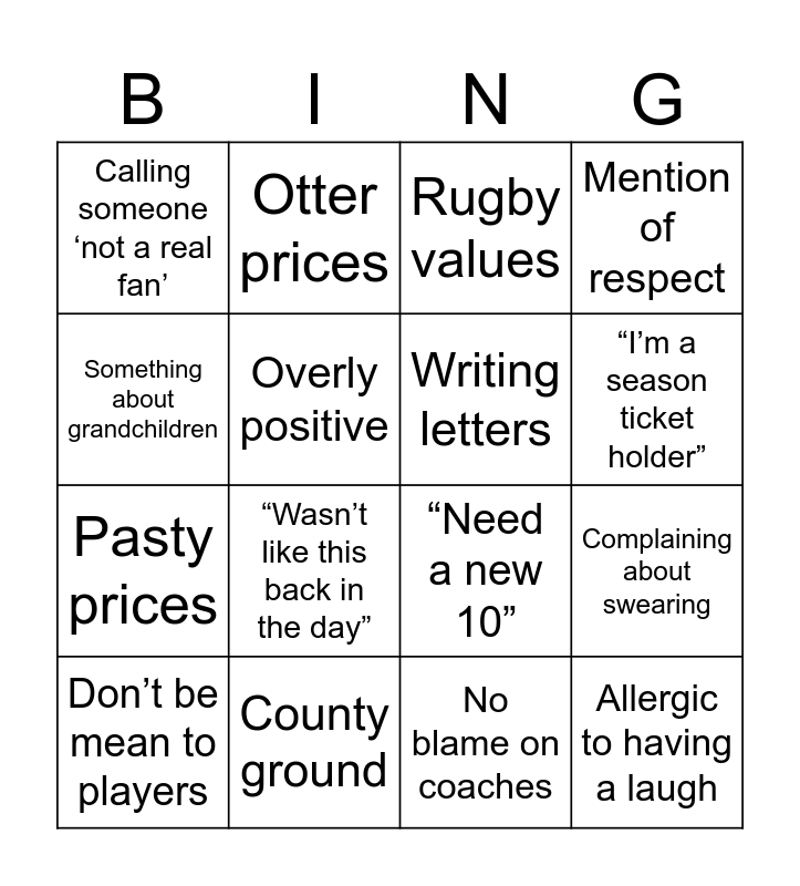 This bingo card has 16 words: County ground, Complaining about swearing, Rugby values, Calling someone ‘not a real fan’, Pasty prices, Otter prices, “Need a new 10”, No blame on coaches, Something about grandchildren, Overly positive, Don’t be mean to players, Mention of respect, “Wasn’t like this back in the day”, “I’m a season ticket holder”, Writing letters and Allergic to having a laugh.