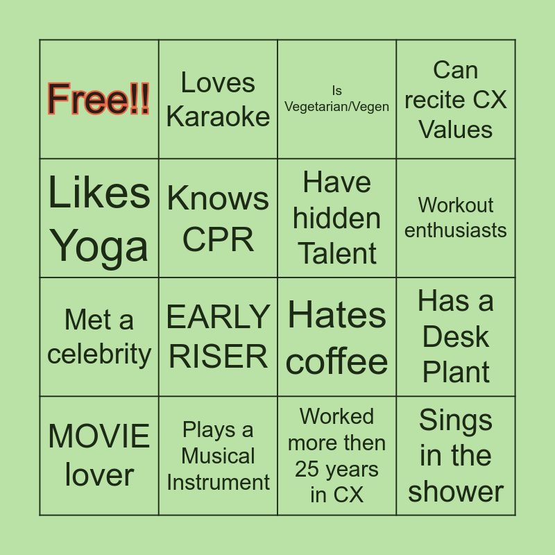 This bingo card has 33 words: Speaks 3 languages, Has a pet, Loves hiking, Slept in a tent, Met a celebrity, Loves Karaoke, Hates coffee, Has fear of heights, Free!!, Knows the office Wifi Password, Worked more then 25 years in CX, Can recite CX Values, Visited 5+ countries, Starts day with Coffee, Writes Left handed, Has a Desk Plant, Travelled for Work, Knows CPR, IS a GAMER, Travelled Solo, MOVIE lover, Has run a marathon, Is Vegetarian/Vegen, Sings in the shower, loves Fishing, EARLY RISER, Have hidden Talent, Workout enthusiasts, Likes Yoga, Plays a Musical Instrument, Owns a Cat, LOVES Cooking and Love Pineapple on Pizza.