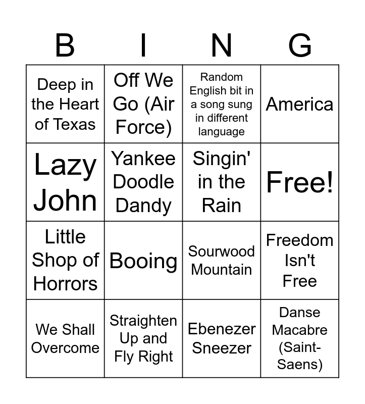 This bingo card has 66 words: Put a Little Love in Your Heart, Soldier, Soldier, Austrian Yodeler, The Army Goes Marching Along, Anchors Aweigh (Navy), Semper Paratas (Coast Guard), Off We Go (Air Force), The Marines' Hymn, Free!, The Lion Sleeps Tonight, Limbo Like Me, Do Re Mi, Ebenezer Sneezer, Lazy John, Gonna Ride Up in the Chariot, Yankee Doodle Dandy, Freedom Isn't Free, Deep in the Heart of Texas, Waitin' for the Light to Shine, Little Shop of Horrors, Skin and Bones, Danse Macabre (Saint-Saens), America, America, the Beautiful, The Star-Spangled Banner, Sing About Martin, The Dream of Martin Luther King, Free at Last, We Shall Overcome, We Shall Not Be Moved, We Go Together, In the Still of the Night, Rock Island Line, Cotton Eye Joe (folk version), Cotton Eye Joe (bluegrass version), Oh, Danny Boy, I'm Gonna Sing, Sourwood Mountain, The Happy Wanderer, Canoe Song, Singin' in the Rain, Over the Rainbow, Straighten Up and Fly Right, Surprise Symphony (Haydn), Fifth Symphony (LVB), Overly sexual backing dancers, Booing, Winking at the camera, Whistling, Mentions how many times host country has won previously, Traditional instruments played on stage, Costume with sequins, Someone on stage in all black, Costume change mid-song, Flag face paint in the audience, Wind machine) or rain on singer, Synchronised dance routine, Presenters speak in unison, Random English bit in a song sung in different language, Presenter outfit change, Acrobatics, Performer wearing all white, Fire or pyrotechnics, Costume with feathers, horns or scales, Someone raps and Looooong high note.