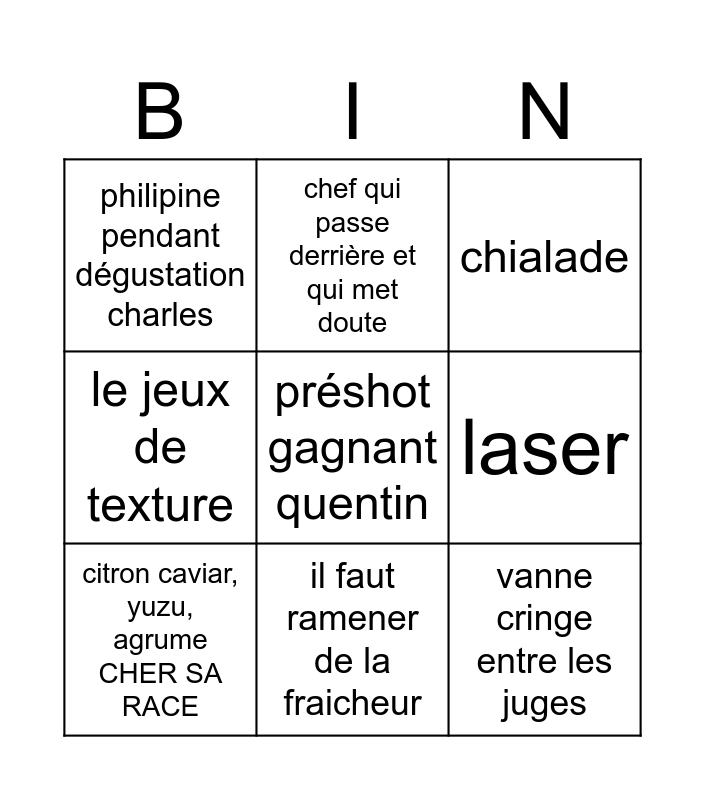 This bingo card has a free space and 8 words: laser, chialade, chef qui passe derrière et qui met doute, citron caviar, yuzu, agrume CHER SA RACE, philipine pendant dégustation charles, vanne cringe entre les juges, le jeux de texture and il faut ramener de la fraicheur.