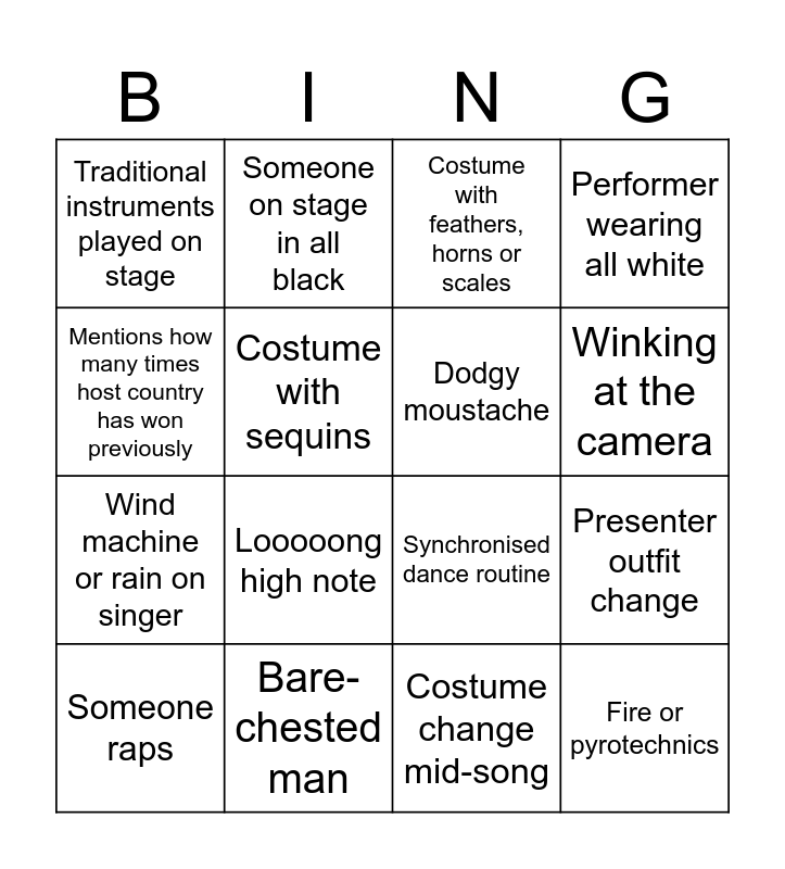 This bingo card has 26 words: Overly sexual backing dancers, Booing, Winking at the camera, Whistling, Mentions how many times host country has won previously, Traditional instruments played on stage, Costume with sequins, Someone on stage in all black, Costume change mid-song, Flag face paint in the audience, Wind machine or rain on singer, Synchronised dance routine, Presenters speak in unison, Random English bit in a song sung in different language, Presenter outfit change, Acrobatics, Performer wearing all white, Fire or pyrotechnics, Costume with feathers, horns or scales, Someone raps, Looooong high note, Presenter breaks into song, Bare-chested man, Traditional costume, Dodgy moustache and Piano playing on stage.