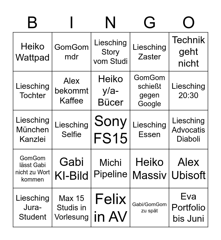 This bingo card has 25 words: Gabi KI-Bild, Felix in AV, Heiko y/a-Bücer, Liesching Jura-Student, Technik geht nicht, Heiko Wattpad, Liesching Tochter, GomGom mdr, Liesching Essen, Michi Pipeline, GomGom schießt gegen Google, Liesching München Kanzlei, Heiko Massiv, Alex Ubisoft, Alex bekommt Kaffee, Eva Portfolio bis Juni, Liesching Advocatis Diaboli, Liesching Story vom Studi, Liesching 20:30, Liesching Selfie, Sony FS15, Max 15 Studis in Vorlesung, GomGom lässt Gabi nicht zu Wort kommen, Liesching Zaster and Gabi/GomGom zu spät.