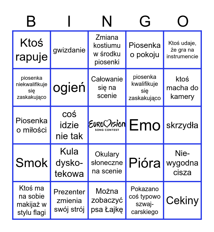 This bingo card has a free space and 33 words: Tradycyjne ubrania, tańce synchro-niczne, coś idzie nie tak, Dźwięki nie są trafione, Smok, ogień, Ktoś udaje, że gra na instrumencie, Ktoś ma na sobie makijaż w stylu flagi, gwizdanie, sztuczny deszcz, Całowanie się na scenie, Zmiana kostiumu w środku piosenki, Ten kraj nie leży w Europie, Ktoś płacze, Emo, ktoś macha do kamery, Prezenter zmienia swój strój, Piosenka o miłości, Kula dysko-tekowa, Pióra, Okulary słoneczne na scenie, Słychać buczenie, Ktoś rapuje, skrzydła, Można zobaczyć psa Łajkę, Cekiny, Piosenka o pokoju, piosenka kwalifikuje się zaskakująco, piosenka niekwalifikuje się zaskakująco, Nie-wygodna cisza, ABBA jest wspomniana, Pokazano coś typowo szwaj-carskiego and Ktoś ma na sobie kapelusz.