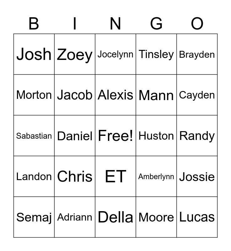 This bingo card has a free space and 28 words: Jossie, Ayden, Mann, Moore, Morton, Jocelynn, Zoey, Landon, Huston, Semaj, Sabastian, Tinsley, Adriann, Della, Cayden, Lily, Chris, Jacob, Alexis, ET, Josh, Kelsey, Lucas, Daniel, Randy, Amberlynn, Brayden and Mason.