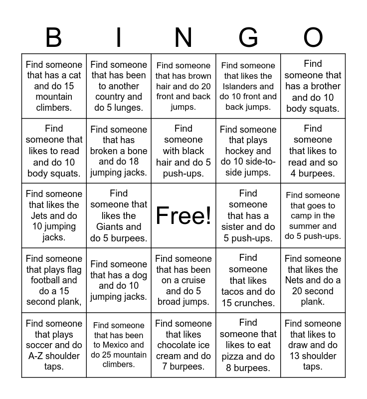 This bingo card has a free space and 24 words: Find someone that has a dog and do 10 jumping jacks., Find someone that has been to Mexico and do 25 mountain climbers., Find someone with black hair and do 5 push-ups., Find someone that plays soccer and do A-Z shoulder taps., Find someone that has a brother and do 10 body squats., Find someone that has a cat and do 15 mountain climbers., Find someone that likes to read and do 10 body squats., Find someone that has been to another country and do 5 lunges., Find someone that has a sister and do 5 push-ups., Find someone that has been on a cruise and do 5 broad jumps., Find someone that plays hockey and do 10 side-to-side jumps., Find someone that likes the Jets and do 10 jumping jacks., Find someone that likes tacos and do 15 crunches., Find someone that likes the Nets and do a 20 second plank., Find someone that has broken a bone and do 18 jumping jacks., Find someone that likes to eat pizza and do 8 burpees., Find someone that goes to camp in the summer and do 5 push-ups., Find someone that has brown hair and do 20 front and back jumps., Find someone that likes to read and so 4 burpees., Find someone that likes the Giants and do 5 burpees., Find someone that likes to draw and do 13 shoulder taps., Find someone that plays flag football and do a 15 second plank,, Find someone that likes the Islanders and do 10 front and back jumps. and Find someone that likes chocolate ice cream and do 7 burpees..
