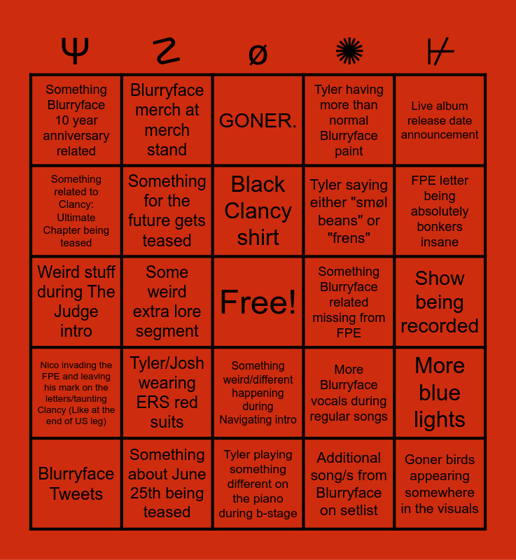 This bingo card has a free space and 24 words: Blurryface Tweets, Tyler/Josh wearing ERS red suits, Black Clancy shirt, Additional song/s from Blurryface on setlist, Live album release date announcement, Something Blurryface 10 year anniversary related, Blurryface merch at merch stand, GONER., Something Blurryface related missing from FPE, Show being recorded, Weird stuff during The Judge intro, Something for the future gets teased, More Blurryface vocals during regular songs, More blue lights, Something related to Clancy: Ultimate Chapter being teased, Something about June 25th being teased, Tyler playing something different on the piano during b-stage, Tyler having more than normal Blurryface paint, FPE letter being absolutely bonkers insane, Nico invading the FPE and leaving his mark on the letters/taunting Clancy (Like at the end of US leg), Some weird extra lore segment, Something weird/different happening during Navigating intro, Tyler saying either "smøl beans" or "frens" and Goner birds appearing somewhere in the visuals.
