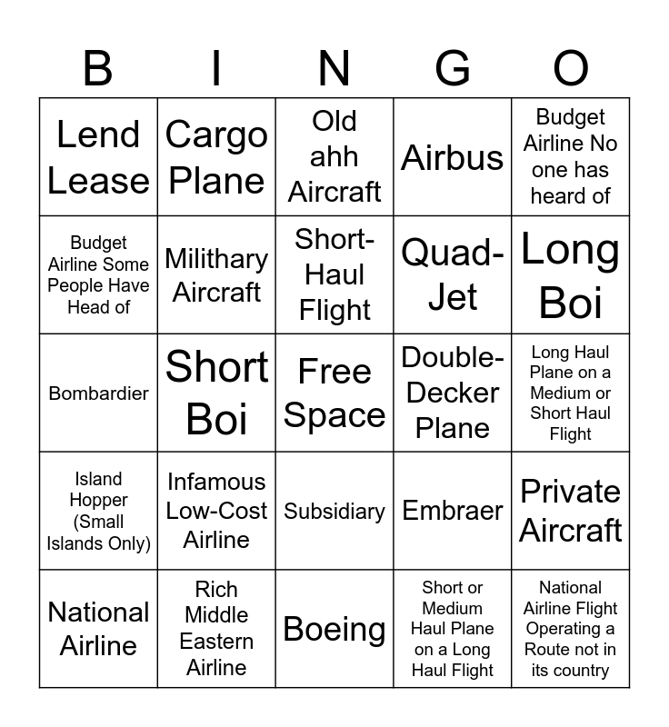 This bingo card has a free space and 24 words: Infamous Low-Cost Airline, Rich Middle Eastern Airline, Short-Haul Flight, National Airline, Budget Airline No one has heard of, Lend Lease, Budget Airline Some People Have Head of, Cargo Plane, Double-Decker Plane, Subsidiary, Quad-Jet, Bombardier, Embraer, Private Aircraft, Milithary Aircraft, Short or Medium Haul Plane on a Long Haul Flight, Long Haul Plane on a Medium or Short Haul Flight, Old ahh Aircraft, Long Boi, Short Boi, National Airline Flight Operating a Route not in its country, Island Hopper (Small Islands Only), Airbus and Boeing.