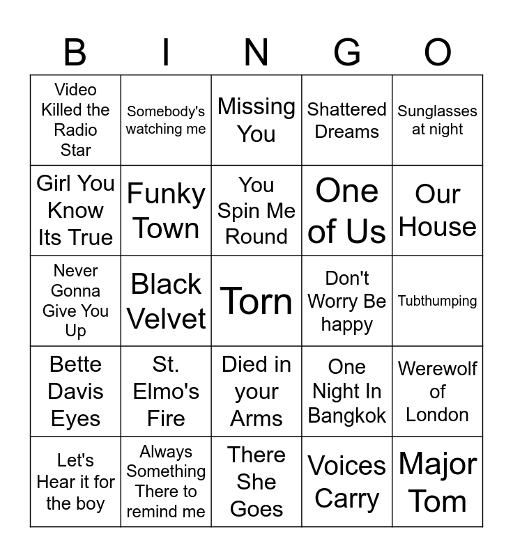 This bingo card has 34 words: Major Tom, Voices Carry, Self Control, Tarzan Boy, Bette Davis Eyes, Funky Town, Sunglasses at night, Let's Hear it for the boy, Somebody's watching me, safety dance, You Spin Me Round, Missing You, Kiss Me, Whip It, Don't Worry Be happy, Our House, Always Something There to remind me, Never Gonna Give You Up, St. Elmo's Fire, One Night In Bangkok, Died in your Arms, The Promise, Video Killed the Radio Star, Tubthumping, There She Goes, Torn, Shattered Dreams, Mmm Mmm Mmm Mmm, One of Us, Girl You Know Its True, Cars, Black Velvet, Werewolf of London and Mad World.