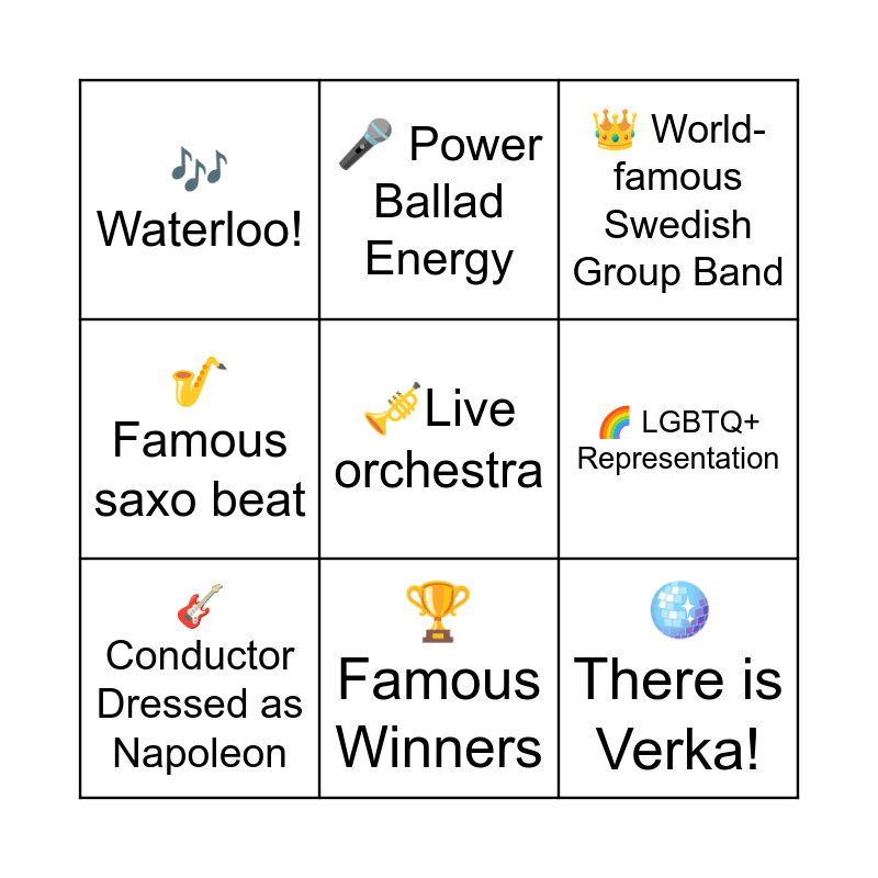 This bingo card has 18 words: πΈ Conductor Dressed as Napoleon, π OMG ABBA!!!!, π World-famous Swedish Group Band, πΆ Waterloo!, π Famous Winners, π LGBTQ+ Representation, π₯ Fire on Stage, π€ Power Ballad Energy, πͺ Overcoming Adversity / Personal Story, π·Famous saxo beat, π€ Performer with Touretteβs Syndrome, πͺ© There is Verka!, π Drag or Gender Performance, πΊLive orchestra, πΌ Angel on stage, πΉ Demons on stage, π Instant Meme Material and π Breaking body stereotypes.