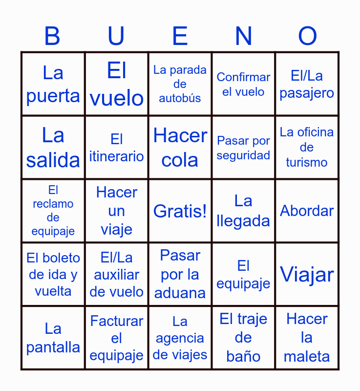 This bingo card has a free space and 24 words: El/La auxiliar de vuelo, Facturar el equipaje, Hacer cola, La pantalla, El/La pasajero, La puerta, La salida, El vuelo, La llegada, Pasar por la aduana, Pasar por seguridad, El reclamo de equipaje, El equipaje, Viajar, El itinerario, El traje de baño, Abordar, La parada de autobús, La oficina de turismo, Hacer un viaje, Hacer la maleta, El boleto de ida y vuelta, Confirmar el vuelo and La agencia de viajes.