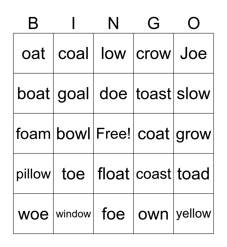 This bingo card has a free space and 25 words: toe, foe, doe, woe, Joe, oat, boat, coal, coat, float, toast, foam, coast, toad, goal, snow, grow, low, slow, bowl, yellow, window, pillow, crow and own.