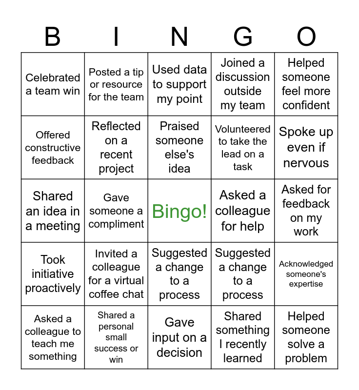 This bingo card has a free space and 24 words: Invited a colleague for a virtual coffee chat, Shared a personal small success or win, Praised someone else's idea, Asked a colleague to teach me something, Helped someone feel more confident, Celebrated a team win, Offered constructive feedback, Posted a tip or resource for the team, Asked a colleague for help, Suggested a change to a process, Volunteered to take the lead on a task, Shared an idea in a meeting, Suggested a change to a process, Acknowledged someone's expertise, Reflected on a recent project, Shared something I recently learned, Asked for feedback on my work, Used data to support my point, Spoke up even if nervous, Gave someone a compliment, Helped someone solve a problem, Took initiative proactively, Joined a discussion outside my team and Gave input on a decision.