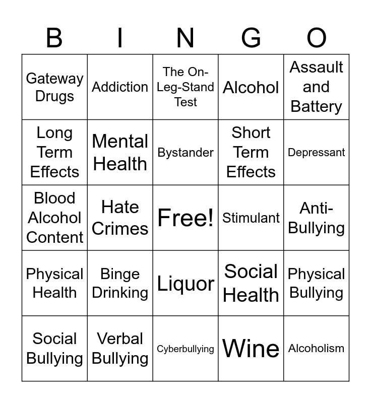 This bingo card has a free space and 36 words: Maslow’s Hierarchy, MLK Day of Service, Environmental Health, Mental Health, Social Health, Physical Health, Bystander, Violence, Assault and Battery, Harassment, Hate Crimes, Alcohol, Substance Abuse, Stimulant, Depressant, Gateway Drugs, Tolerance, Binge Drinking, Alcoholism, The On-Leg-Stand Test, Anti-Bullying, Physical Bullying, Verbal Bullying, Social Bullying, Cyberbullying, Addiction, Blood Alcohol Content, Field Sobriety Tests, Short Term Effects, Long Term Effects, Intoxicated, Beer, Wine, Liquor, Serving Size and Social Drinking.