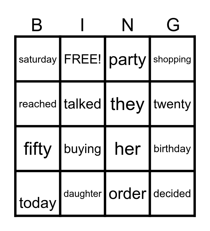 This bingo card has 16 words: today, daughter, party, shopping, reached, FREE!, her, birthday, saturday, talked, order, twenty, fifty, buying, they and decided.