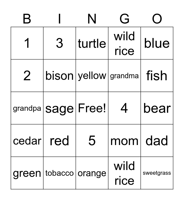 This bingo card has a free space and 25 words: red, orange, yellow, green, blue, 1, 2, 3, 4, 5, grandma, grandpa, mom, dad, bison, eagle, bear, turtle, fish, sage, sweetgrass, tobacco, cedar, wild rice and wild rice.