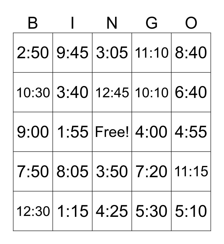 This bingo card has a free space and 30 words: 1:15, 1:35, 1:55, 2:10, 2:50, 3:05, 3:40, 3:50, 4:00, 4:25, 4:55, 5:10, 5:30, 6:35, 6:40, 7:10, 7:20, 7:50, 8:05, 8:40, 9:00, 9:25, 9:45, 10:10, 10:30, 11:10, 11:15, 12:30, 12:45 and 12:00.