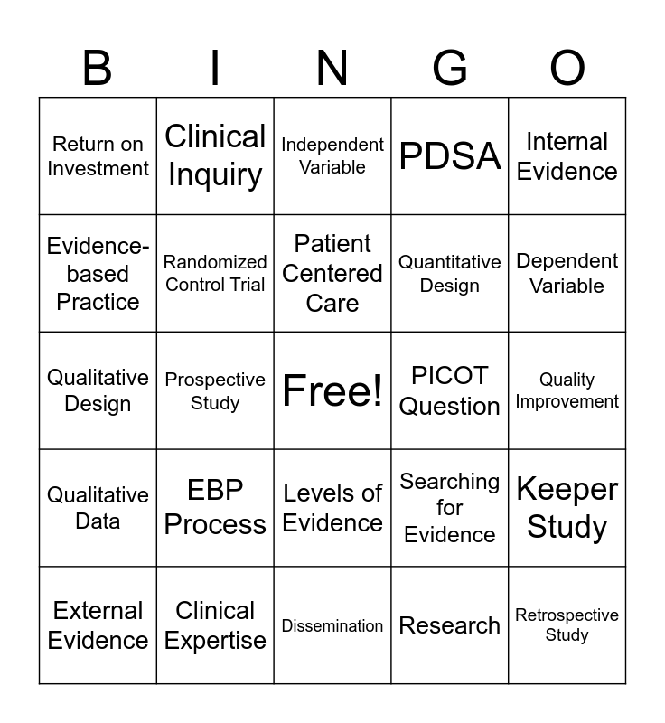 This bingo card has a free space and 24 words: EBP Process, Clinical Expertise, Patient Centered Care, External Evidence, Internal Evidence, Return on Investment, Evidence-based Practice, Clinical Inquiry, PICOT Question, Levels of Evidence, Quantitative Design, Qualitative Design, Searching for Evidence, Keeper Study, Randomized Control Trial, Research, Quality Improvement, Independent Variable, Dependent Variable, Prospective Study, Retrospective Study, Qualitative Data, PDSA and Dissemination.