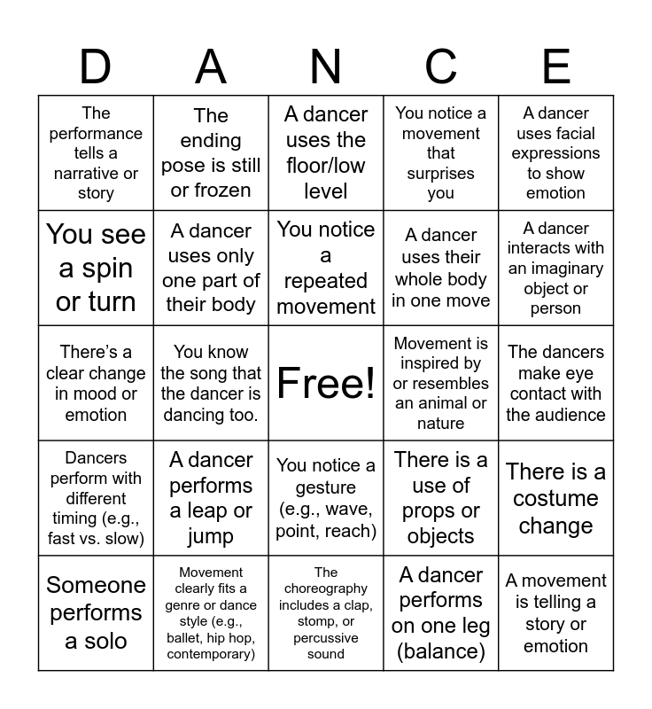 This bingo card has a free space and 24 words: A dancer performs a leap or jump, Movement clearly fits a genre or dance style (e.g., ballet, hip hop, contemporary), You notice a repeated movement, Someone performs a solo, A dancer uses facial expressions to show emotion, The performance tells a narrative or story, You see a spin or turn, The ending pose is still or frozen, Movement is inspired by or resembles an animal or nature, You notice a gesture (e.g., wave, point, reach), A dancer uses their whole body in one move, There’s a clear change in mood or emotion, There is a use of props or objects, There is a costume change, A dancer uses only one part of their body, A dancer performs on one leg (balance), The dancers make eye contact with the audience, A dancer uses the floor/low level, A dancer interacts with an imaginary object or person, You know the song that the dancer is dancing too., A movement is telling a story or emotion, Dancers perform with different timing (e.g., fast vs. slow), You notice a movement that surprises you and The choreography includes a clap, stomp, or percussive sound.