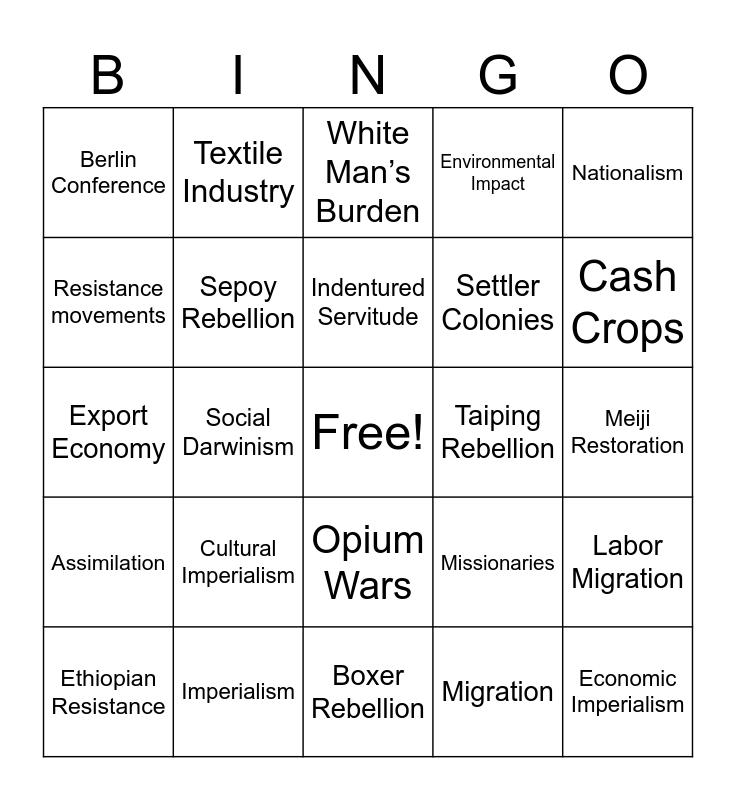 This bingo card has a free space and 30 words: Imperialism, Colonialism, Social Darwinism, Scramble for Africa, Berlin Conference, White Man’s Burden, Sepoy Rebellion, Opium Wars, Taiping Rebellion, Boxer Rebellion, Meiji Restoration, Economic Imperialism, Migration, Diaspora, Cash Crops, Infrastructure, Missionaries, Assimilation, Cultural Imperialism, Nationalism, Export Economy, Industrialization, Textile Industry, Settler Colonies, Resistance movements, Environmental Impact, Labor Migration, Ethiopian Resistance, Indentured Servitude and Raw Materials.