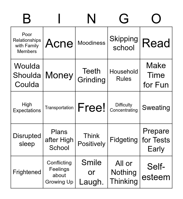 This bingo card has a free space and 24 words: Plans after High School, Conflicting Feelings about Growing Up, Teeth Grinding, Frightened, Read, Poor Relationships with Family Members, Woulda Shoulda Coulda, Acne, Difficulty Concentrating, Think Positively, Household Rules, High Expectations, Fidgeting, Prepare for Tests Early, Money, All or Nothing Thinking, Sweating, Moodiness, Make Time for Fun, Transportation, Self-esteem, Disrupted sleep, Skipping school and Smile or Laugh..