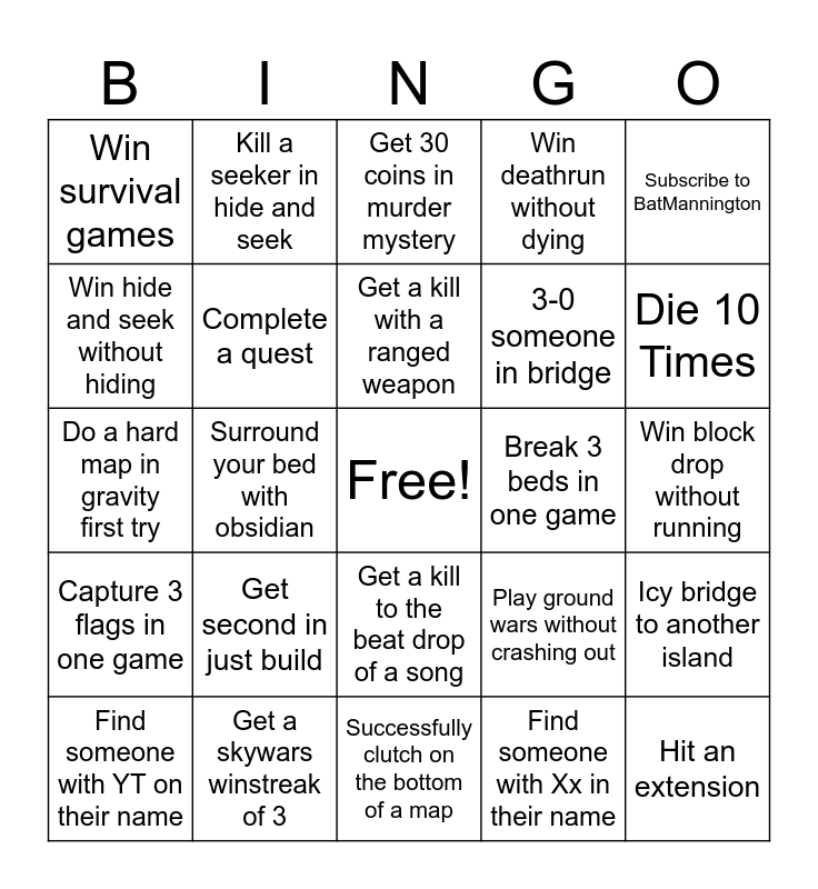 This bingo card has a free space and 24 words: Get second in just build, Get a skywars winstreak of 3, Get a kill with a ranged weapon, Find someone with YT on their name, Subscribe to BatMannington, Win survival games, Win hide and seek without hiding, Kill a seeker in hide and seek, Break 3 beds in one game, Get a kill to the beat drop of a song, 3-0 someone in bridge, Do a hard map in gravity first try, Play ground wars without crashing out, Icy bridge to another island, Complete a quest, Find someone with Xx in their name, Win block drop without running, Get 30 coins in murder mystery, Die 10 Times, Surround your bed with obsidian, Hit an extension, Capture 3 flags in one game, Win deathrun without dying and Successfully clutch on the bottom of a map.