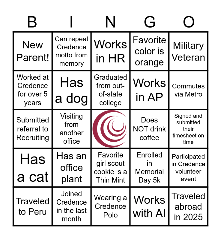This bingo card has a free space and 29 words: Traveled to Peru, Has been scuba diving, Visiting from another office, Dual Citizen, New Parent!, Works in HR, Has a dog, Has an office plant, Does NOT drink coffee, Joined Credence in the last month, Signed and submitted their timesheet on time, Traveled abroad in 2025, Wearing a Credence Polo, Works with AI, Commutes via Metro, Speaks multiple languages, Favorite girl scout cookie is a Thin Mint, Has a cat, Military Veteran, Submitted referral to Recruiting, Enrolled in Memorial Day 5k, Works in IT, Works in AP, Worked at Credence for over 5 years, Favorite color is orange, Can repeat Credence motto from memory, Participated in Credence volunteer event, Graduated from out-of-state college and Graduated from VA college.