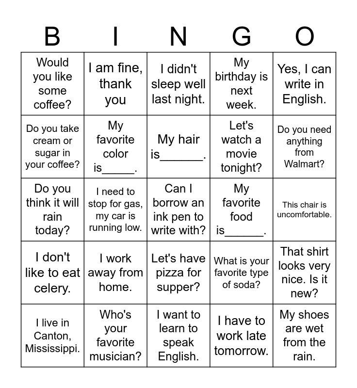 This bingo card has 25 words: I work away from home., I want to learn to speak English., My hair is______., I live in Canton, Mississippi., Yes, I can write in English., Would you like some coffee?, Do you take cream or sugar in your coffee?, I am fine, thank you, My favorite food is______., Let's have pizza for supper?, Let's watch a movie tonight?, Do you think it will rain today?, What is your favorite type of soda?, That shirt looks very nice. Is it new?, My favorite color is_____., My shoes are wet from the rain., This chair is uncomfortable., I didn't sleep well last night., Do you need anything from Walmart?, I need to stop for gas, my car is running low., Can I borrow an ink pen to write with?, Who's your favorite musician?, I don't like to eat celery., My birthday is next week. and I have to work late tomorrow..