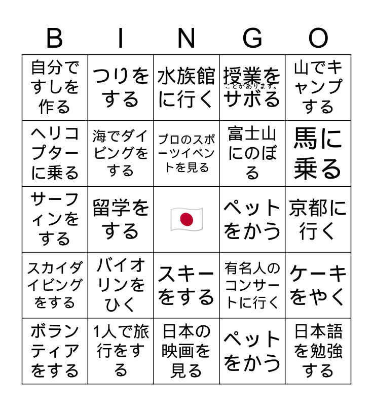 V(た)ことがあります | 〜たことがある | 経験ビンゴ | 経験(けいけん) | 行ったことがありますか?