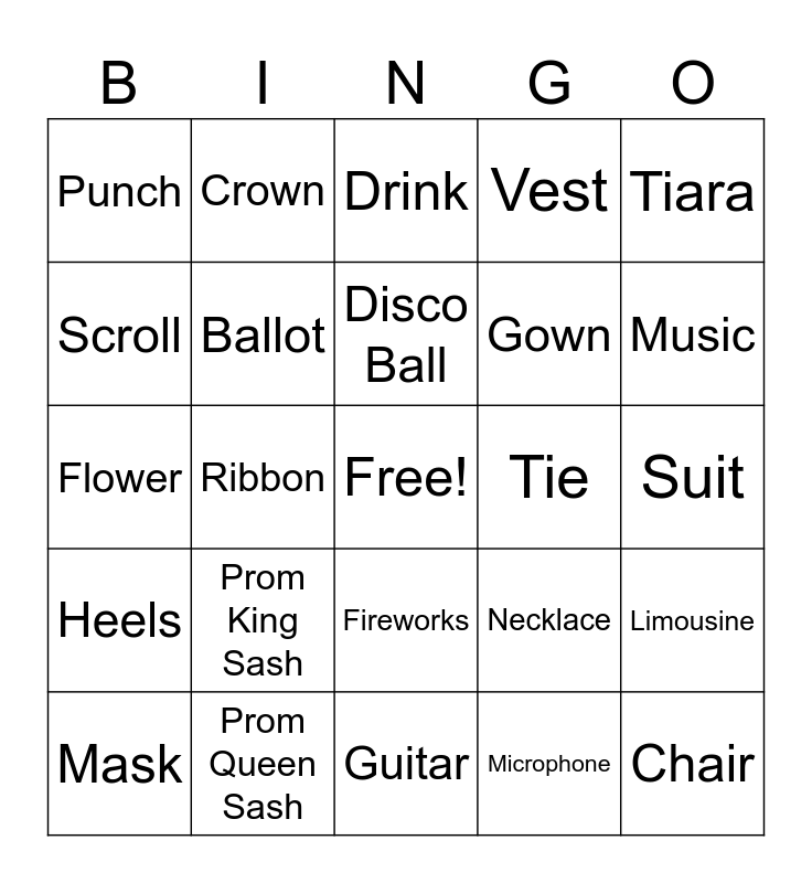 This bingo card has a free space and 24 words: Prom King Sash, Prom Queen Sash, Disco Ball, Mask, Tiara, Punch, Scroll, Crown, Tie, Fireworks, Gown, Flower, Necklace, Limousine, Ballot, Microphone, Suit, Drink, Music, Ribbon, Chair, Heels, Vest and Guitar.