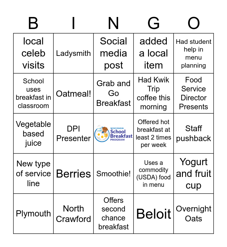 This bingo card has a free space and 54 words: Added a new fruit to menu, New type of service line, increase in participation, added a scratch made item, Smoothie!, From scratch muffin, added a local item, Hear someone mention Mini Cinnis, School uses breakfast in classroom, Not enough staff hours, local celeb visits, kickoff event involving school board, North Crawford, Plymouth, Breakfast Burrito, Offers second chance breakfast, Overnight Oats, Had Kwik Trip coffee this morning, Had Teacher input / assistance, Staff pushback, Uses a commodity (USDA) food in menu, Sheet Pan Pancakes, Offered hot breakfast at least 2 times per week, Had student help in menu planning, White Lake SD, Ladysmith, Wautoma, Howard Suamico, Richland, Beloit, Clear Lake SD, Black River Falls SD, St Anthony School, Kingdom Prep School, Social media post, used "lucky tray", Vegetable based juice, Yogurt and fruit cup, Parfait with homemade granola, Oatmeal!, Veggies on the menu, Supportive Administration, Hard Boiled Eggs, Cheese!, Berries, Breakfast Quesadilla, Breakfast Pizza, Dried Fruit, Grab and Go Breakfast, DPI Presenter, Food Service Director Presents, Poster Presentation, Used a student survey and "Build your own" menu item.