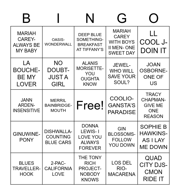 This bingo card has a free space and 34 words: HOOTIE AND THE BLOWFISH- ONLY WANNA BE WITH YOU, LOS DEL RIO- MACARENA, SHERYL CROW- IF IT MAKES YOU HAPPY, KEITH SWEAT- NOBODY, GINUWINE- PONY, NO DOUBT- JUST A GIRL, LL COOL J- DOIN IT, BLUES TRAVELLER- HOOK, OASIS- WONDERWALL, SMASHING PUMPKINS- 1979, ALANIS MORISETTE- YOU OUGHTA KNOW, DEEP BLUE SOMETHING- BREAKFAST AT TIFFANY’S, BLACKSTREET- NO DIGGITY, COLLECTIVE SOUL- THE WORLD I KNOW, COOLIO- GANSTA’S PARADISE, JOAN OSBORNE- ONE OF US, 2-PAC- CALIFORNIA LOVE, JANN ARDEN- INSENSITIVE, DISHWALLA- COUNTING BLUE CARS, GIN BLOSSOMS- FOLLOW YOU DOWN, DONNA LEWIS- I LOVE YOU ALWAYS FOREVER, BONE THUGS N HARMONY- THA CROSSROADS, MARIAH CAREY- ALWAYS BE MY BABY, TRACY CHAPMAN- GIVE ME ONE REASON, THE TONY RICH PROJECT- NOBODY KNOWS, QUAD CITY DJS- CMON RIDE IT, MARIAH CAREY WITH BOYS II MEN- ONE SWEET DAY, CELINE DION- BECAUSE YOU LOVED ME, JEWEL- WHO WILL SAVE YOUR SOUL?, LA BOUCHE- BE MY LOVER, GOO GOO DOLLS- NAME, MERRIL BAINBRIDGE- MOUTH, SOPHIE B HAWKINS- AS I LAY ME DOWN and MELISSA ETHRIDGE- I WANNA COME OVER.