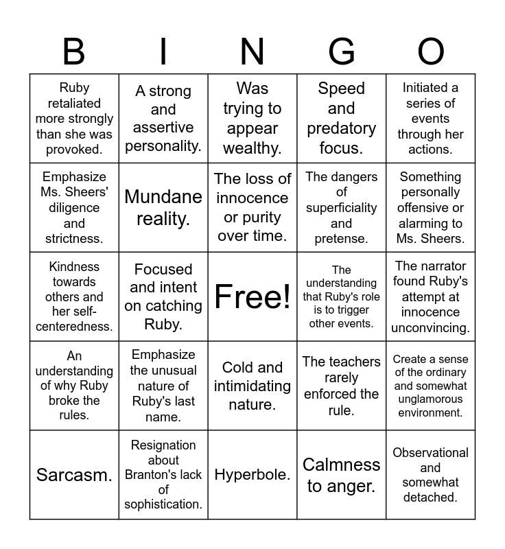 This bingo card has a free space and 24 words: Emphasize the unusual nature of Ruby's last name., Resignation about Branton's lack of sophistication., The loss of innocence or purity over time., Sarcasm., Initiated a series of events through her actions., Ruby retaliated more strongly than she was provoked., Emphasize Ms. Sheers' diligence and strictness., A strong and assertive personality., The understanding that Ruby's role is to trigger other events., Cold and intimidating nature., The dangers of superficiality and pretense., Kindness towards others and her self-centeredness., The teachers rarely enforced the rule., Create a sense of the ordinary and somewhat unglamorous environment., Mundane reality., Calmness to anger., The narrator found Ruby's attempt at innocence unconvincing., Was trying to appear wealthy., Something personally offensive or alarming to Ms. Sheers., Focused and intent on catching Ruby., Observational and somewhat detached., An understanding of why Ruby broke the rules., Speed and predatory focus. and Hyperbole..