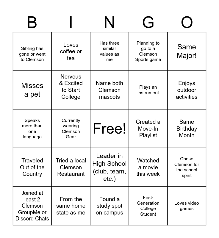 This bingo card has a free space and 24 words: Tried a local Clemson Restaurant, From the same home state as me, Name both Clemson mascots, Joined at least 2 Clemson GroupMe or Discord Chats, Same Major!, Sibling has gone or went to Clemson, Misses a pet, Loves coffee or tea, Created a Move-In Playlist, Leader in High School (club, team, etc.), Plays an Instrument, Speaks more than one language, Watched a movie this week, Chose Clemson for the school spirit, Nervous & Excited to Start College, First-Generation College Student, Same Birthday Month, Has three similar values as me, Enjoys outdoor activities, Currently wearing Clemson Gear, Loves video games, Traveled Out of the Country, Planning to go to a Clemson Sports game and Found a study spot on campus.