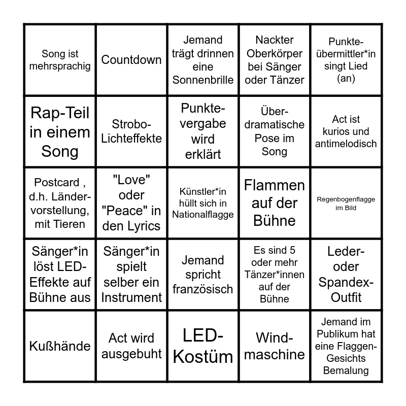 This bingo card has 50 words: Sänger*in liegt auf dem Boden, Künstler*in hüllt sich in Nationalflagge, Traditionelles Kostüm / Tracht, LED-Kostüm, Sänger*in spielt selber ein Instrument, Kostümwechsel im Song, Countdown, Handherzen für die Zuschauer, Rap-Teil in einem Song, Nebel auf der Bühne, Strobo-Lichteffekte, Nackter Oberkörper bei Sänger oder Tänzer, Leder- oder Spandex-Outfit, Es sind 5 oder mehr Tänzer*innen auf der Bühne, "Europe, stop voting now", Telefongeste in die Kamera, Punkte-vergabe wird erklärt, Flammen auf der Bühne, Drag Queens im Bild, Punkte-übermittler*in singt Lied (an), "Love" oder "Peace" in den Lyrics, Wind-maschine, Song ist mehrsprachig, Über-dramatische Pose im Song, Akrobatik auf der Bühne, Jemand im Publikum hat eine Flaggen- Gesichts Bemalung, Act ist kurios und antimelodisch, Dem Gastgeber wird für den Abend gedankt, Jemand trägt drinnen eine Sonnenbrille, Jemand spricht französisch, Im Greenroom wird angestoßen, "Good Evening Europe good morning Australia", Sänger*in ist Barfuß, Jemand sagt „Grand Prix“, Act wird ausgebuht, 12 Punkte für Deutschland, Outfit aus Lack und Leder, Duett, Konfetti-Regen, Regenbogenflagge im Bild, Goldregen, Overknees, "You're good to go", Die Halle singt laut hörbar mit, Kußhände, Postcard , d.h. Länder-vorstellung, mit Tieren, lange künstliche Fingernägel, Sänger*in steht auf Podest oder ähnlichem, Sänger*in löst LED-Effekte auf Bühne aus and Publikum wird zum mitklatschen animiert.